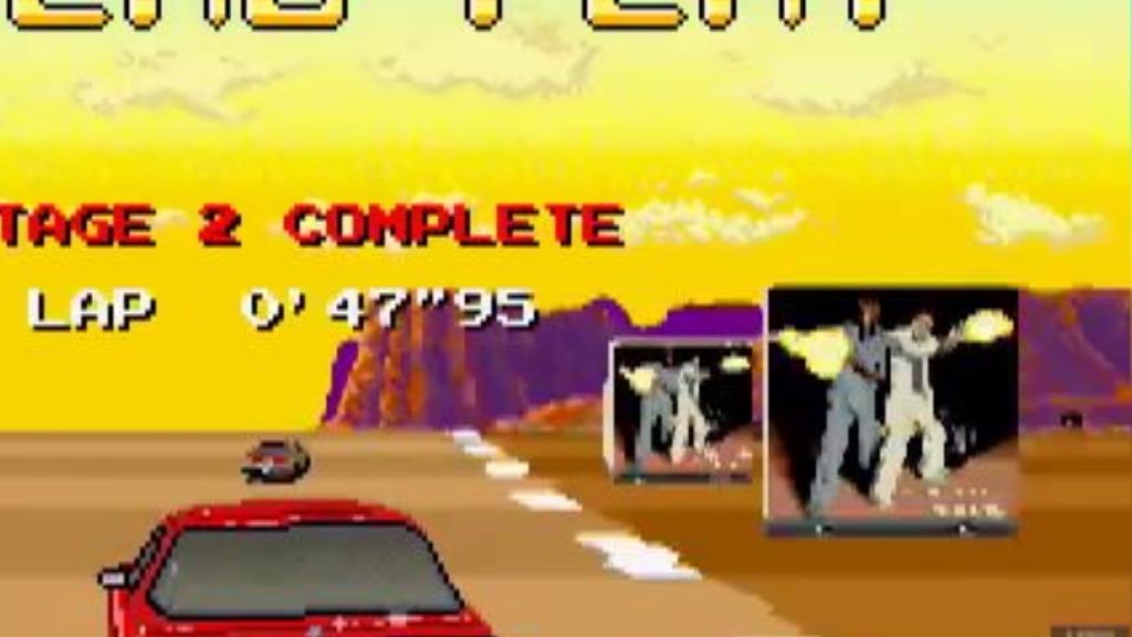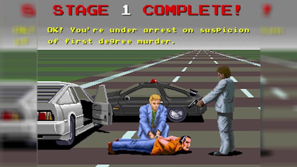 From this point, you experience something that only the arcade cabinet can really produce. It’s like all those 80s cop chase sequences combined into one hands on experience. There’s a sense of euphoric coolness. The graphics, music, engine sounds and digitised speech all add up to provide a visceral excitement of speed and determination as you race against the clock to catch up with your assailant. Take too long and he’ll get away. Catch up with him and you get a time extension to smash him off the road. At it’s heart, the game is still an against the clock racer, but this time, you have a mission, a purpose, and when you reach your purpose, you have the additional dynamic of manovering your car to cause as much damage as possible without negatively impacting your speed. Observe the massive “Criminals here” arrow, listen to Brody’s almost giddy enthusiasm, fill the damage meter until the car is on brink of a nasty explosion and jobs’a’goodun. You can apprehend your suspect (possibly Robert Di’nero) and read his rights (is that the voice of George Taki?). Given these vigilante tactics, you might assume that this is a world where the police require policing, but let’s not get too metaphysical in this world of pixelated police.